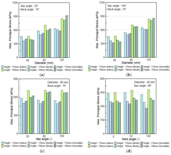 Maximum principal stress according to (a,b) diameter; (c) iliac angle; and (d) neck angle.