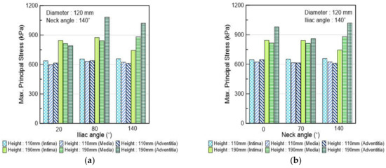 Maximum principal stress according to (a) iliac angle and (b) neck angle.
