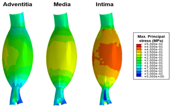 Maximum principal stress distributions in the adventitia, media, and intima layers of the representative model.