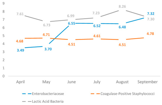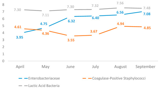 As reported in Figure 2 and Figure 3, over the 6 months examined period, the number of bacteria from Enterobacteriaceae family ranged from 3.95 ± 0.35 log CFU/mL to 7.08 ± 0.15 log CFU/mL in sheep’s milk and 3.49 ± 0.13 log CFU/mL to 7.32 ± 0.19 CFU/mL goat’s milk. The results showed significant change (p < 0.001) of number of bacteria from Enterobacteriaceae family, which increased from April to September.