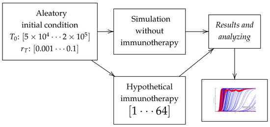 To begin, the numerical experiments was proposed that every hypothetical immunotherapy was testing with 100 different initial conditions, randomly choosing the parameters of tumor growth r in a range between to and the initial tumor cells in a range between and (See diagram in Figure 1).