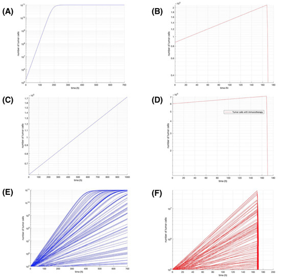 Figure 3, presents the results obtained by applying 100 different initial conditions randomly chosen between the tumor growth rate and the initial tumor cell taking into account infusions of DCs injected every 168 h. The red curves represent the tumor growth with DC immunotherapy treatment and blue curves represent the growth of tumor cells without treatment. Figure 3A shows only one simulation without immunotherapy treatment likewise, Figure 3B shows the result applying the immunotherapy treatment using the same initial conditions and parameters of growth rate and carrying capacity reported by Kronik [18]. The Figure 3C,D show the results of the same initial conditions but with the parameters of growth rate and carrying capacity obtained from the biological experiment reported by Castillo-Montiel E [17]. Figure 3E,F show the results of 100 different simulations setting random initial conditions but using the same scheme of immunotherapy treatment, see Table 2 for numerical results. As can be seen in image A, the growth of tumor cells remains fixed after reaching a maximum of tumor cells at approximately 200 h, on the other hand, in image C, growth continues after 200 h because it has not yet the maximum size of 6754 × tumor cells is reached, however when applying the infused cell therapy every 72 h for 3 weeks, the same successful result is obtained on the growth of the tumor cells by presenting its decrease at 170 h (see Figure 3B,D).