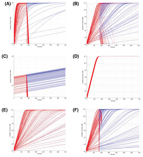 Hypothetical therapies results. They represent the tumor growth with the immunotherapy treatment and blue curves represent the growth of tumor cells without treatment. In Figure 3 all simulations implement a therapy using DCs infused every 72 h by 3 weeks using 100 different initial conditions. Subfigures (A,C) shows the result of one simulation without treatment; likewise, subfigures (B,D) shows also the result of one simulation but with immunotherapy treatment. Additionally, subfigures (E,F) show the results but for 100 different simulations showing the same behavior as before.
