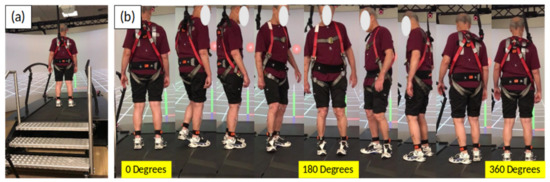(a) Experimental setup where a representative participant is supported by an overhead harness and looking at a virtual target. (b) Participant turning 360°.