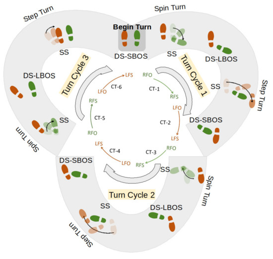 Each turn cycle includes one spin turn followed by a step turn. Spin turn has a single support (SS critical phase) (or corresponding critical time, CT) and double support with large base of support (DS-LBOS). The step turn has a single support (or corresponding CT) and double support with small base of support (DS-SBOS). Figure 2 shows six critical times in three turn cycles when the participant was turning and when supported by one foot. Turning events like right foot off (RFO), right foot strike (RFS), left foot off (LFO), and left foot strike (LFS) with critical times (CT1–CT6) are shown during 3 turn cycles. Two trials where participants initiated turns by both right and left side were collected (only right-side initiation is represented in Figure 2).