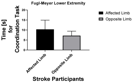 The demographic data showed that the age and BMI were significantly different (p < 0.05). Fugl-Meyer lower extremity assessments were done in both healthy participants and those after stroke, as shown in Figure 3. For individuals after stroke, the time for coordination of task was assessed for the participants’ affected and opposite side (or less affected) (Figure 4). Persons after stroke took significantly more turn cycles than healthy individuals with p = 0.0014 (5.4 ± 0.37 s versus 3.45 ± 0.36 s) (Figure 5a). Participants after stroke also had significantly more critical time than healthy older adults; p = 0.0054 (Figure 5b). They also had more critical phases than healthy counterparts; p = 0.0004 (Figure 5c).