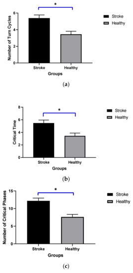 (a) Average number of turn cycles in stroke and healthy groups. (b) Critical time in seconds in stroke and healthy adults. (c) Number of critical phases during 360° turn in stroke and healthy adults. Where * represents significant different among groups.