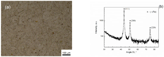 Initial microstructure of the investigated steel: (a) light microscopy (LM) image and (b) X-ray diffraction (XRD) pattern.