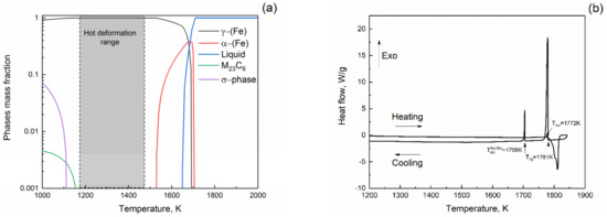 The temperature range for hot deformation of 1173–1473 K was chosen accordingly to thermodynamic calculations. The dependence of the mass fraction of the phases on temperature is shown in Figure 2a. The austenite is the only phase present in the temperature range of 1173–1473 K. This fact was approved experimentally: as one can see from Figure 2b, there are no significant effects in the chosen temperature diapason on the DTA-curve.