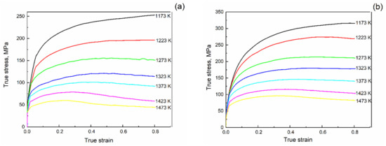 The mechanical testing at elevated temperatures (tension, compression, and torsion with tension) was carried out using the thermomechanical simulator Gleeble 3800 (DSI Systems, Dallas, TX, USA). Samples for compression were cylinders with a height of 15 mm and a diameter of 10 mm. The specimens with cylindrical deformation zone with a diameter of 5 and 10 mm and lengths of 10 and 20 mm were used for tensile and torsion with tension tests, respectively. A high vacuum of 10−3 Pa was created in the chamber before heating to prevent oxidation at high temperatures. The heating rate up to the deformation temperature was 5 K·s−1. Hot deformation was carried out in the temperature range of 1173–1473 K and at strain rates of 0.1–10 s−1. The samples were immediately quenched after the deformation by compressed air. Compression stress–strain curves were recalculated to consider the friction and adiabatic heating during deformation [49,50].