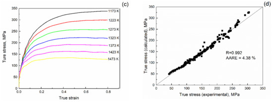True stress vs. true strain curves for hot deformation of the AISI 316Ti steel at a strain rate of (a) 0.1 s−1, (b) 1 s−1, and (c) 10 s−1. The comparison between the predicted and the experimental values of the flow stress (d).