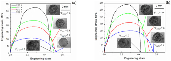 Tensile tests at temperatures of 1173, 1273, 1373, and 1473 K and strain rates of 1 s−1 and 10 s−1 were carried out to determine the fracture strain (the relative cross-section reduction (Ψ) after failure). The engineering stress–strain curves, the fracture surface of the samples, and the values of Ψ are shown in Figure 4.