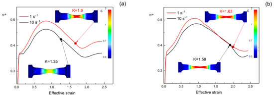 Experimental tensile curves of the AISI 316Ti steel at (a) 1 s−1 and (b) 10 s−1 (the values ΨT is the relative cross-section reduction at the correspondent temperature).