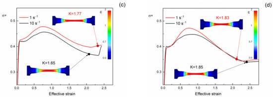 The second step of the united model development is a mathematical description of the fracture conditions during the ductile materials’ deformation at high temperatures. By now, the fracture process can be described in two ways: using models of nucleation and the growth of pores and cracks [13,14,15] and phenomenological models of the relationship between the fracture criterion and the processing parameters. The first approach involves complex models of pore formation and evolution at the microstructural level. The second approach does not imply modelling the material flow at the microlevel, considering only the effect of deformation conditions on macroscopic fracture. Even though the first type of model has a greater physical justification, the second has simple regularities and a significantly smaller number of unknown parameters, making it more attractive for practical application. One of the first phenomenological models was the Johnson–Cook model [16], which describes the dependence of critical strain on stress triaxiality (σ*), strain rate () and deformation temperature ():