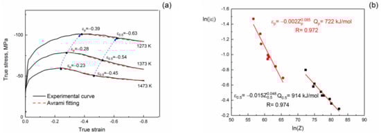 where is the peak stress which corresponds to the stress of the deformed grains, is the steady-state stress characterizing the deformation resistance of the recrystallized grains, and is the current stress value. Examples of the fittings using the JMAK model (14) and Equation (34) are shown in Figure 7a. The kd parameter has a value of about 1.7 for all compression tests conducted at the temperatures of 1373, 1423, and 1473 K and the strain rates of 0.1, 1, and 10 s−1. This value approximately correspondent to the ones obtained earlier [36,58].