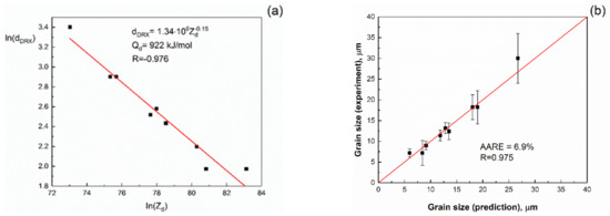 Dependence of ln(dDRX) on lnZ (a) and (b) a comparison of the experimental and calculated grain size after hot deformation of the AISI 316Ti steel.