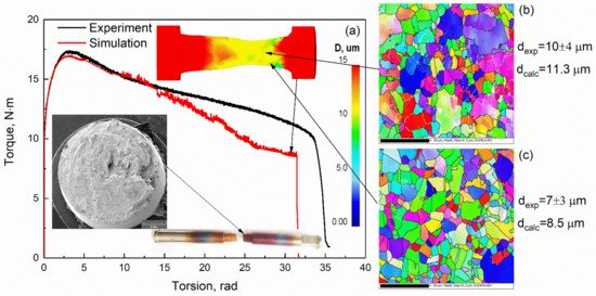 The torsion with tension test was conducted experimentally and simulated using the FE method to approve the constructed models. As shown in Figure 10a, the experimental and calculated torque vs. torsion curves are in good accordance (the average absolute relative error was 6.9%). The traces of the severe plastic deformation are seen on the fracture surface. The failure proceeded after large plastic deformation by torsion and with insignificant localization due to tension forces.