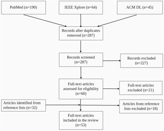Flow diagram of the review process. Of 287 identified research papers, thirty-nine were included in the review (PubMed n = 31, IEEE Xplore n = 6, ACM Digital Library n = 2). In addition, fourteen papers from the reference lists were included in the review.