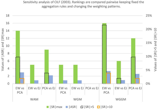 Sensitivity analysis chart of CILF (2003). Rankings are compared pairwise keeping fixed the aggregation rules and changing the weighting patterns.