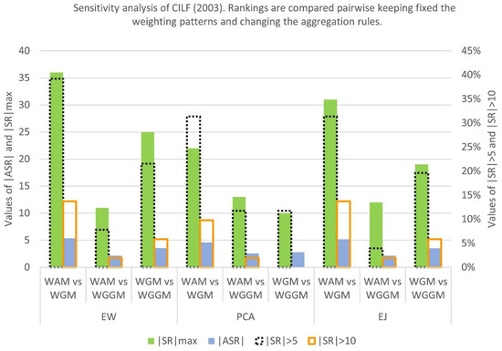 Sensitivity analysis chart of CILF (2003). Rankings are compared pairwise keeping fixed the weighting patterns and changing the aggregation rules.