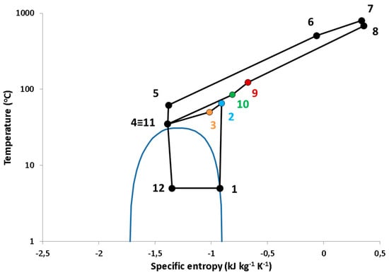 Temperature-specific entropy (T-s) diagram for the studied polygeneration system in nominal operating conditions (logarithmic vertical axis).