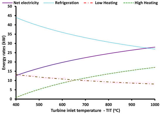 Figure 4 and Figure 5 show the system performance variation for the different values of the turbine inlet temperature (TIT). This parameter is a critical one for Brayton cycles and so it is also important for the present system. Figure 4 indicates that higher TIT increases power production and high heating, while it reduces the low heating and refrigeration production. Figure 5 proves that higher values of TIT increase both the energy and the exergy efficiency of the system. So, it is proved that higher TIT values are beneficial for the system performance, such as in the Brayton cycle where higher TIT increases the power production.