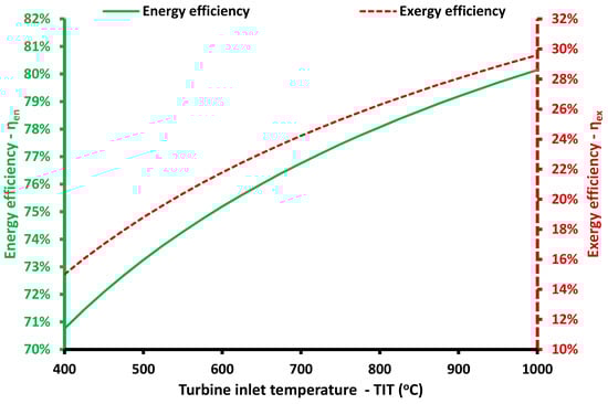 Energy and exergy efficiencies for different values of the turbine inlet temperature.