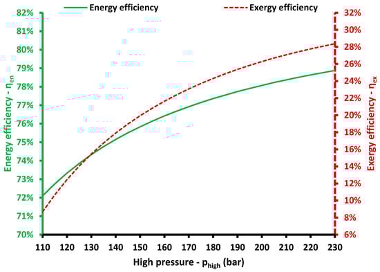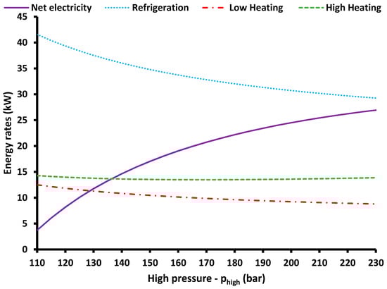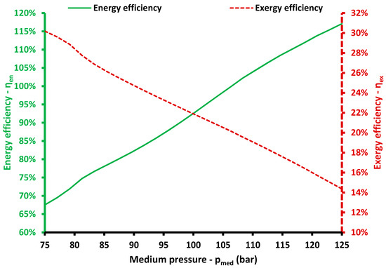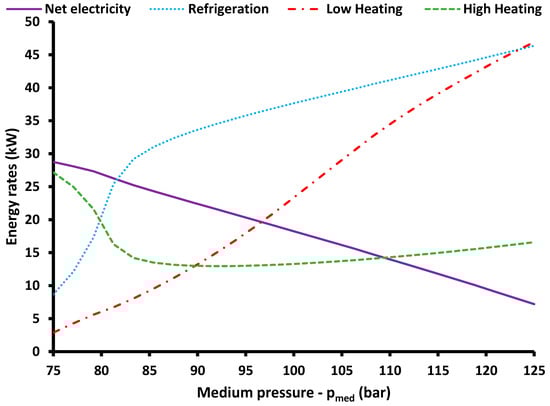 Figure 8 and Figure 9 exhibit the impact of the medium pressure on the results. This pressure level has to be over the CO2 critical pressure, which is 73.8 bar, and so the minimum examined value was 75 bar. Generally, values very close to the critical point were avoided because of stability problems in this area. The increase of medium pressure leads to a higher low-heating temperature level and to lower net electricity production. The refrigeration production increases at a great pace up to 85 bar and after this limit, at a slower pace. The high heating production reduces up to 81 bar at a great pace, and then at a slower pace, it was minimized approximately at 95 bar and after this limit, it presents a rough increase. The above-described behavior of the Figure 8 curves can be explained by the great deviation of the CO2 thermal properties with its pressure, in the cases with pressure levels close to the critical point (75–85 bar). Figure 9 indicates that the increase of the medium pressure leads to higher energy efficiency but to lower exergy efficiency. So, there is no global optimum value for this parameter and an intermediate value is maybe the optimum one. Moreover, different values of this parameter can be selected in order to adjust the useful output values (or fraction) according to the energy rate demands in every application.