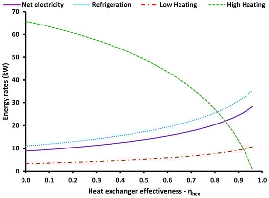 Figure 10 and Figure 11 illustrate the system behavior with the increase of the heat exchanger effectiveness. According to Figure 10, this parameter leads to higher electricity, refrigeration and low heating production but to lower high heating production. Practically, the higher effectiveness of the heat exchanger gives a lower margin for high heating production after the heat exchanger, and thus, this parameter has different behavior than the other parameters. Figure 11 shows that the exergy efficiency is enhanced by the improvement of the heat exchanger effectiveness but the energy efficiency is reduced with the increase of the effectiveness value.