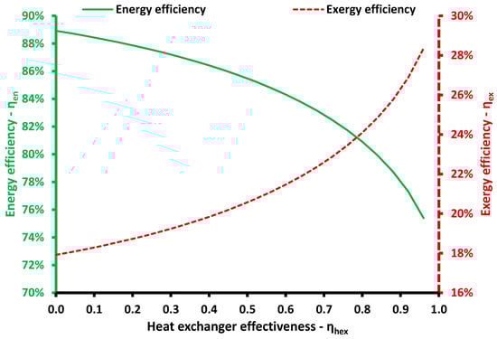 Energy and exergy efficiencies for different values of the heat exchanger effectiveness.