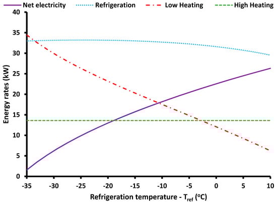 Figure 12 and Figure 13 give the system performance for different refrigeration temperature levels. Figure 12 shows that refrigeration production is not so affected by the refrigeration temperature, as well as the high heating production. On the other hand, it is obvious that a higher refrigeration temperature leads to a significant increase in electricity production and an important decrease in low heating production. Figure 13 indicates that a higher refrigeration temperature increases the system exergy efficiency, while the energy efficiency is maximized for refrigeration production at around −25 °C. Generally, the energy efficiency is not so variable in the range between −35 °C and −15 °C, while for higher refrigeration temperatures it shows a significant decrease. At this point, it is important to note that CO2 operation in temperatures as low as −35 °C is not a difficult task because CO2 is used in supermarket refrigeration applications where temperature levels of around −35 °C are usually applied.