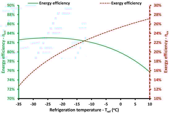 Energy and exergy efficiencies for different values of the refrigeration temperature.