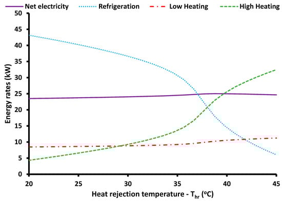 Figure 14 and Figure 15 show the system behavior with different heat rejection temperature levels. Practically, this parameter is the temperature level in the outlet of the gas cooler and it has to be 3 to 5 °C more than the ambient temperature. In this work, it was studied from 20 °C to 45 °C and in all cases, the medium pressure was more than the critical pressure. Figure 14 shows that the electricity and the low heating production increase sightly with the heat rejection increase. On the other hand, the high heating and the refrigeration show more intense behavior with the first increasing and the other reducing with the heat rejection temperature augmentation. The behavior of these curves is a bit strange after 35 °C because of the variation in the CO2 properties in this region (close to the critical point). Figure 15 shows that higher heat rejection temperatures lead to higher exergy efficiency and to lower energy efficiency.