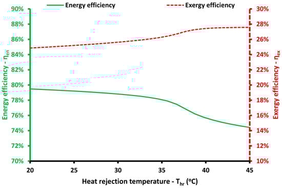 Energy and exergy efficiencies for different values of the heat rejection temperature.