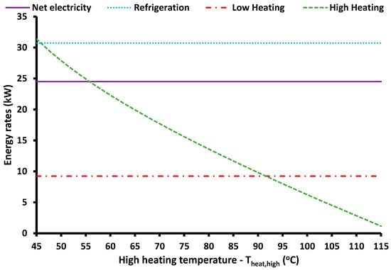 Figure 16 and Figure 17 present the system behavior for different values of the high heating temperature. Practically, all of the useful outputs are not affected and only the high heating temperature is decreased with the increase of its temperature level, as Figure 16 shows. Figure 17 indicates that the energy efficiency reduces with the increase in the high heating temperature while the exergy efficiency is maximized at 65.4 °C with a value of 26.5%, and in this case, the energy efficiency is 85.57%.