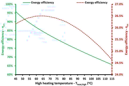 Energy and exergy efficiencies for different values of the high heating temperature.