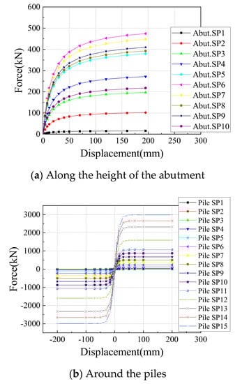 Based on site testing results, was taken as , and for loosely, medium-densely and densely compacted cases respectively [36], where is the height of the pile cap. For an abutment with a height of 3.9 m, was taken as , and for loosely, medium-densely and densely compacted cases respectively [36,37]. Figure 3a shows the force–displacement relationship of the soil springs along the height of the abutment for the prototype bridge, where the abutment backfill was densely compacted.