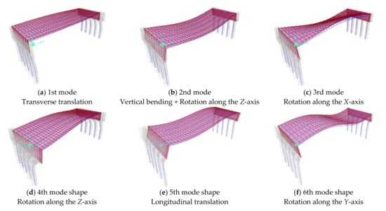 Model analyses were performed on 16 SIAB models, in which the skew angle varied from 0°, 15°, 30° to 45°, and the abutment backfill varied from no-backfill (soil-free) to loosely, medium-densely and densely compacted sand. The first six mode shapes for Model 10, the prototype bridge model with a 15° skew and densely compacted backfill, are shown in Figure 4. As shown in the figure, when there is a skew angle, the major vibration modes of integral abutment bridge include transverse translation, vertical bending, in-plane rotation, longitudinal translation, rotation about the longitudinal axis (X), and rotation about the transverse axis (Y) etc., and the first vibration mode is transverse translation.