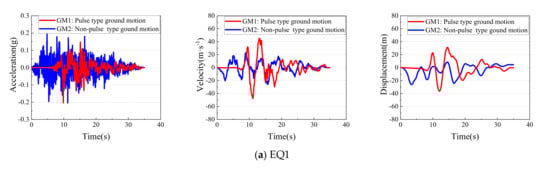 A design response spectrum was generated for the prototype bridge, based on a site category of class II, a seismic fortification intensity of degree VIII, a design seismic group of class C, a design seismic acceleration of 0.2 g, as well as the bed rock conditions of the region. The response spectrum of the near-fault seismic ground motion records from the strong ground motion database in PEER [40] were then matched with the design response spectrum above, and three records with the best fitting accuracy were chosen, which were the ground motion records from the Yarimaca Test Site station in the Kocaeli earthquake (EQ1), the Newhall-W_Pico_Canyon_Rd Test Site station in the Northridge earthquake (EQ2), and the Takatori Test Site station in the Kobe earthquake(EQ3). Magnitudes of the chosen earthquake records varied from M6.7 to M7.9, the distances from the Test Site stations to the rupture sources were all less than 10 km, the peak ground velocities (PGV) were significantly higher than 20 cm/s, and the PGV to peak ground acceleration (PGA) ratios were larger than 0.2 s. Parameters of the three selected near-fault ground motions are listed in Table 3.