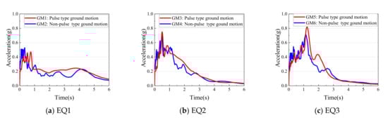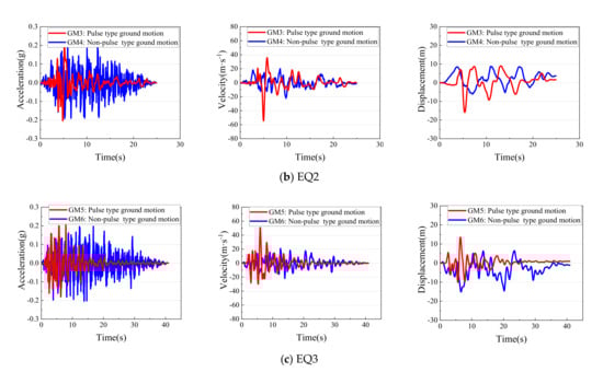 Three corresponding non-pulse artificial seismic records (GM2, GM4, GM6) were produced using the SIMQKE_GR software, which were consistent with the response spectra of the near-fault seismic records (GM1, GM3, GM5). The acceleration, velocity, and displacement time-histories of both the pulse and non-pulse type ground motions are shown in Figure 5, where it is clear that there are distinctive two-side or one-side pulses in the velocity time-histories of pulse type ground motions with rupture forward-directivity effect or reverse-directivity effect. The acceleration response spectra of all ground motions are shown in Figure 6, where it is clear that the acceleration response spectra of the pulse type ground motions fit well with the non-pulse ones. The PGV/PGA ratios of non-pulse type ground motions are generally small, and less than 0.11 in this paper. Table 3 presents the characteristic parameters of the pulse type and non-pulse type ground motions, and PGA of the six ground motions was uniformly adjusted to 0.2 g.