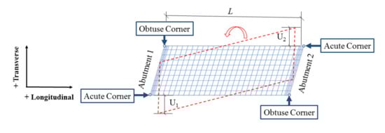 where represents transverse displacement of abutment 1 at obtuse corner, represents transverse displacement of abutment 2 at acute corner, and is the bearing to bearing distance of the skewed integral abutment bridge.