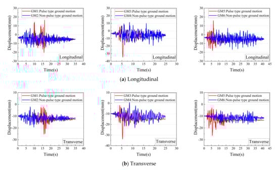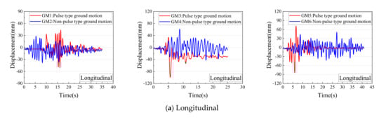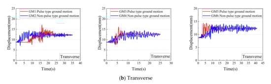 Time-history curves of the longitudinal and transverse displacement of the abutment are shown in Figure 8 and Figure 9 below for Model 12 (skew angle is 45°, densely compacted backfill) and Model 16 (skew angle is 45°, no backfill), respectively. As shown in the Figures, the abutment displacement time-history under the pulse and non-pulse type ground motions are quite different, although the PGA was the same, and the pulse type ground motions obviously induced much higher abutment displacements, which is more destructive for the bridge. In addition, when there was backfill behind the abutment, the longitudinal displacement of the abutment was significantly decreased, especially under pulse-type ground motions.