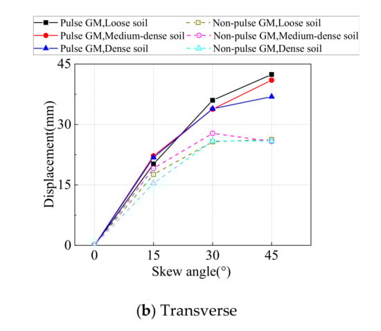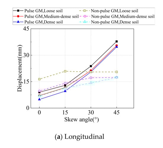 - The longitudinal and transverse displacement of the abutment generally increases with the skew angle, mainly due to the decreased constraints of the backfill on abutment longitudinal displacements and the increased coupling between the longitudinal and transverse displacements of the bridge deck. The longitudinal and transverse displacement of the abutment generally decreases with the abutment backfill compactness. Under pulse type ground motions, the longitudinal and the transverse abutment displacement are obviously higher than the abutment displacements under non-pulse type ground motions, and the differences increase with the skew angle.
