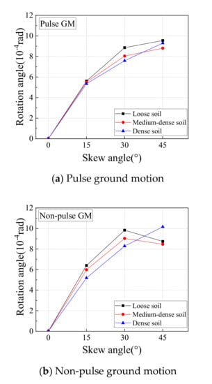 - The bridge deck rotation generally increases with the skew angle due to the coupling between the longitudinal and transverse displacements, especially with densely compacted backfill. The deck rotation generally decreases with the abutment backfill compactness. Under pulse type ground motions, the bridge deck rotations are close and sometimes lower than the deck rotations under non-pulse type ground motions, except when the skew angle is 45° and with medium densely and loosely compacted backfill.