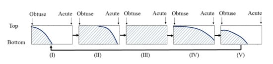 When the earthquake ground motion is inputted along the longitudinal direction of a bridge with a skew angle, the resultant force of soil pressure behind the abutment does not pass through the mass center of the bridge, which makes the superstructure twist and lead to the non-uniform distribution of soil pressure behind the abutment. The development of soil pressure behind the abutment during one typical cycle in a time-history analysis is shown in Figure 12 below. At first, the bottom left portion of the abutment at the obtuse corner gets in contact with the soil, and creates soil pressure as shown as the shaded area in stage (I) in Figure 12. The soil pressure gradually develops until it covers the whole abutment, as shown in stage (III). Then the top right portion of the abutment at the acute corner starts to move away from the soil, and the soil pressure there becomes zero, as shown in stage (IV). More top right portions of the abutment move away from the soil, and finally the soil pressure distribution in stage (IV) will be similar to stage (I). During this process, the soil pressure behind the abutment at the obtuse corner is always greater than the soil pressure at the acute corner.