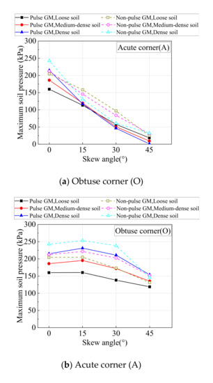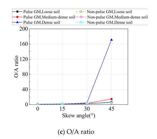 It is also shown in Figure 13 that although the soil pressure behind the abutment under pulse type ground motions is generally smaller than non-pulse type ground motions, the O/A ratio is higher. When the skew angle is 45° and the backfill is densely compacted, the O/A ratio is 4.5 under non-pulse type ground motions and as high as 170 under pulse type ground motions. Therefore, the distribution of the soil pressure behind a skewed abutment is non-uniform, which is more obvious under pulse type ground motions, with the increase of the skew angle and soil compactness.