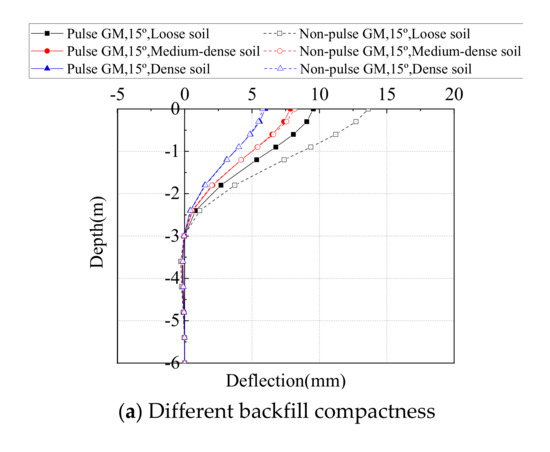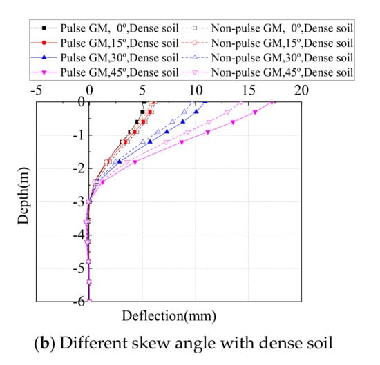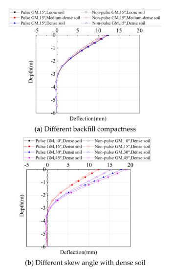 It is also shown in Figure 15 that when the skew angle is small, the longitudinal deflection at the pile top is lower under pulse type ground motions, especially for loosely compacted backfill and the transverse deflection is close. But when the skew angle is more than 15°, both the longitudinal and the transverse deflection of the pile is higher under pulse type ground motions.