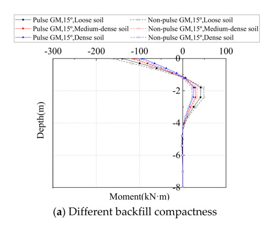 From the time-history analyses, it was found that the maximum bending moment was always located at the top. Therefore, only the value at the pile top is discussed in this section, and the maximum value at the pile top from time-history analyses on all SIAB models with varying skew angles and backfill compactness are shown in Figure 20. As shown in Figure 20, for all cases, meaning that no plastic-hinge was formed at the pile top during the nonlinear time-history analyses. It is clear from the figure that under non-pulse type ground motions, the value decreases with the backfill compactness, indicating that when the backfill is densely compacted, it decreases the normal stress in steel piles. For densely compacted backfill, the value increases with the skew angle, but it is the opposite trend for loosely compacted backfill.