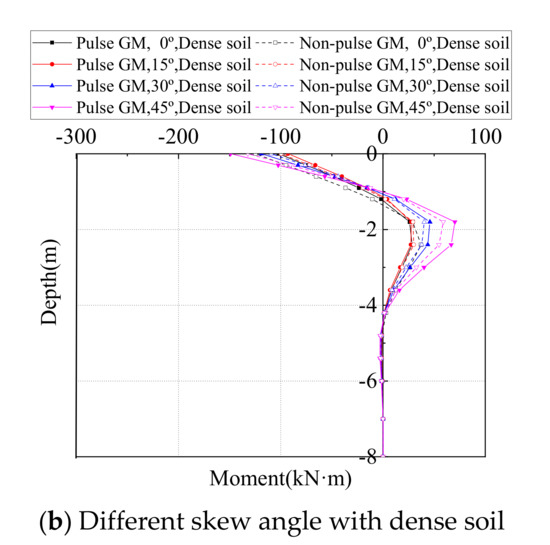 Under pulse type ground motions, the value still decreases with the backfill compactness, but it consistently increases with the skew angle for all types of backfill. For the densely compacted backfill, the value with a 45° skew angle can be 4.8 times the value with no skew. In addition, when there is no skew, the values are smaller under pulse-type ground motions than non-pulse type ground motions, but as the skew angle increases, the values under pulse-type ground motions increases so sharply that they are about 2 times the value under non-pulse type ground motions, when the skew angle is 45° for all types of backfill. Therefore, the near-fault effects significantly increase the normal stress in steel piles, and amplify the influence of the skew angle.