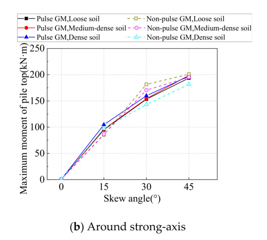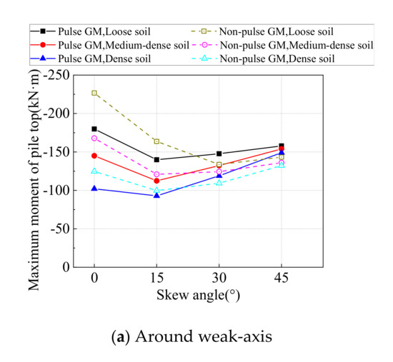 - The moment around the weak-axis first decreases and then increases with the skew angle, while moment around the strong-axis always increases with the skew angle. The moment around the weak-axis and the strong-axis decrease with the abutment backfill compactness. When the skew angle is larger than 15°, the moment at the pile top is higher under pulse type ground motions, especially with densely compacted backfill.